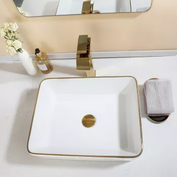 Gold Edge White Ceramic Vessel Sink Set with Waterfall Tap & Pop-Up Drain